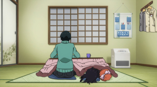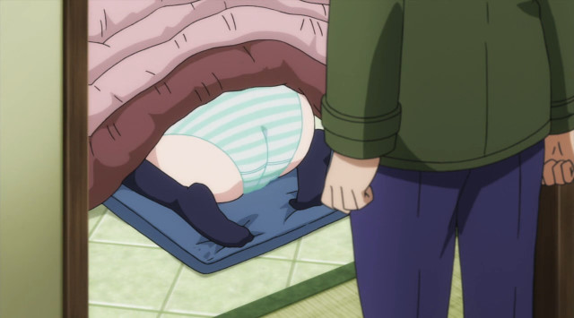 七海の出しておいた物とは炬燵だった。美月は早速炬燵でくつろぐと、そのままテスト勉強を始める。同じ頃、夕哉も帰宅。居間から聞こえる美月の声に反応して扉を開けてみると、消しゴムを取る為にパンツ丸出しの状態で炬燵に頭を突っ込んだ美月の姿だった。