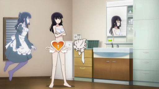 ドレッシングまみれになった日和(仮称)は脱衣所で服を脱ぎ、身体を洗おうとするのだが、突然予定を変更して裸エプロンを敢行し始める。美月はすぐさま入れ替わる事でこれを拒絶するも、そこに風呂から上がってきた全裸姿の夕哉が入ってくる。驚きのあまり硬直する裸エプロン姿の美月を見た夕哉は、鳥井に教えられた裸エプロンの事を理解するも、直後羞恥心に耐えられなくなった美月の張り手を食らうのだった。