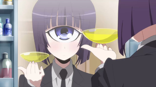洗面所でイメチェンをしようとカラーコンタクトを試してみるマナコ。